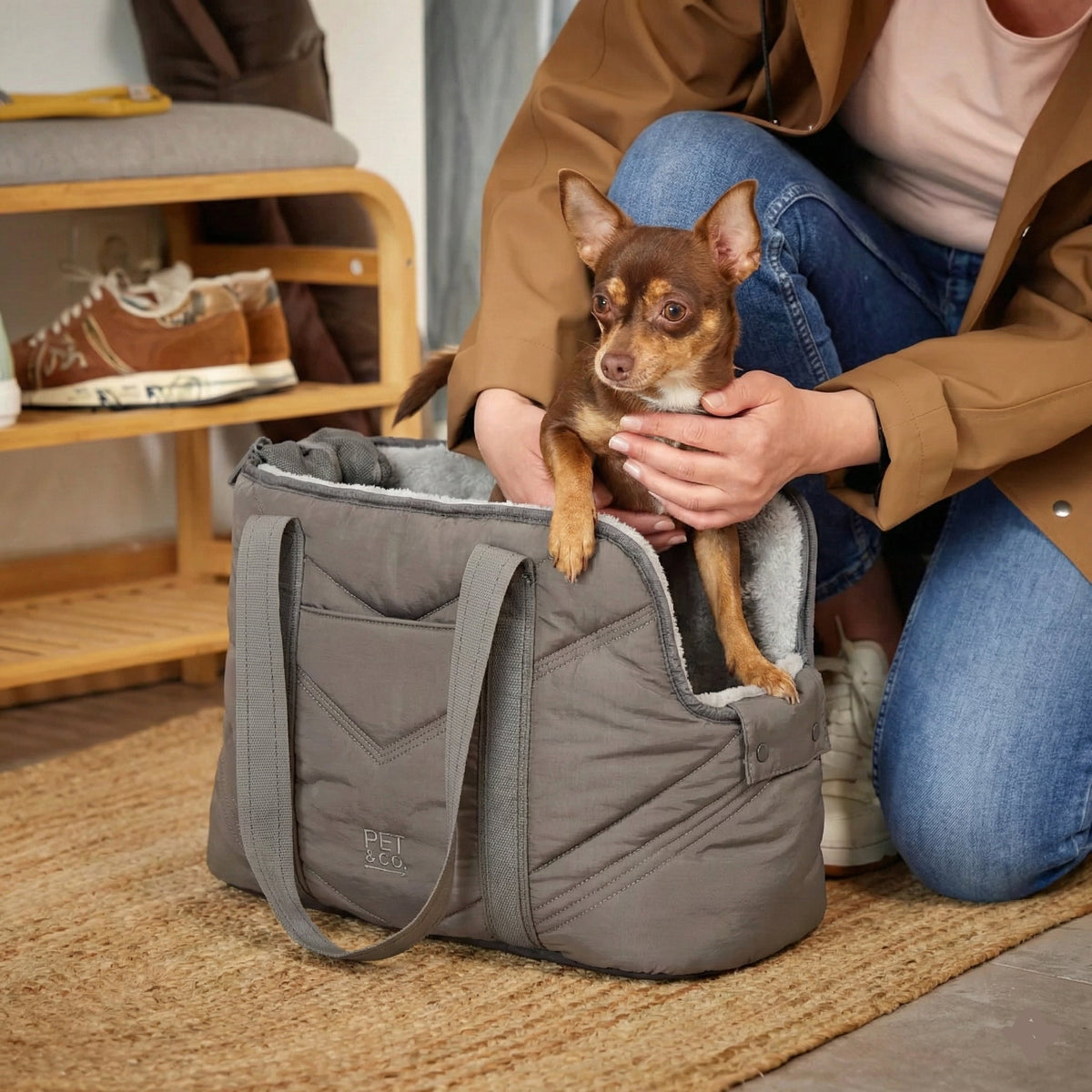 Geeignet für kleine Hunde bis ca. 8 kg, die gerne nah bei dir sind und sicher transportiert werden möchten.